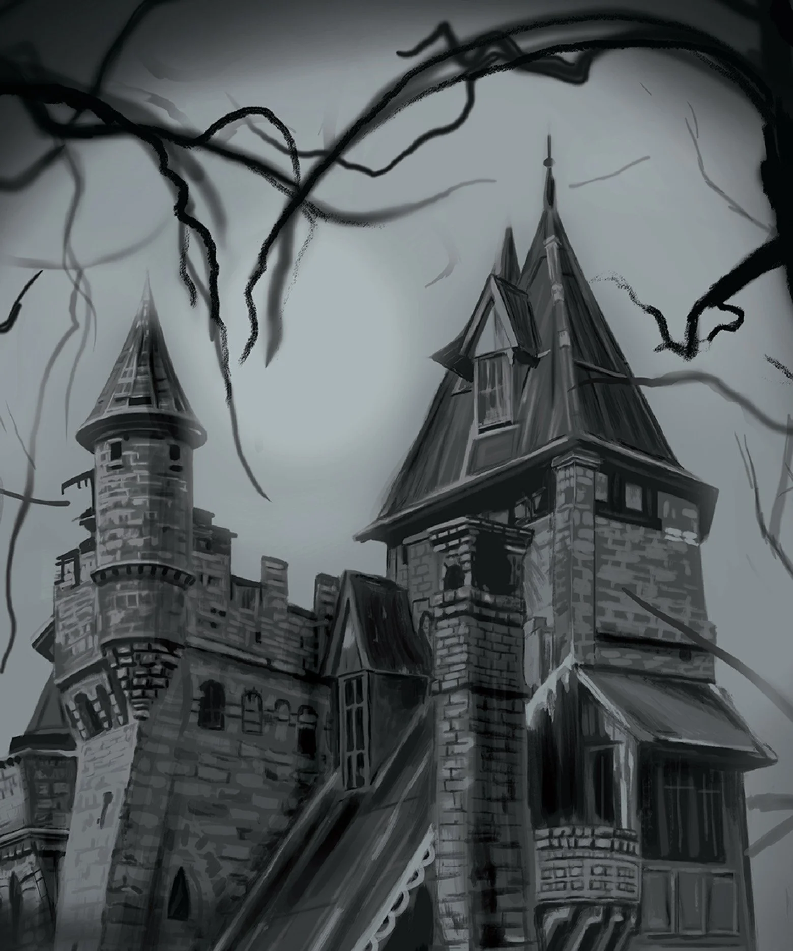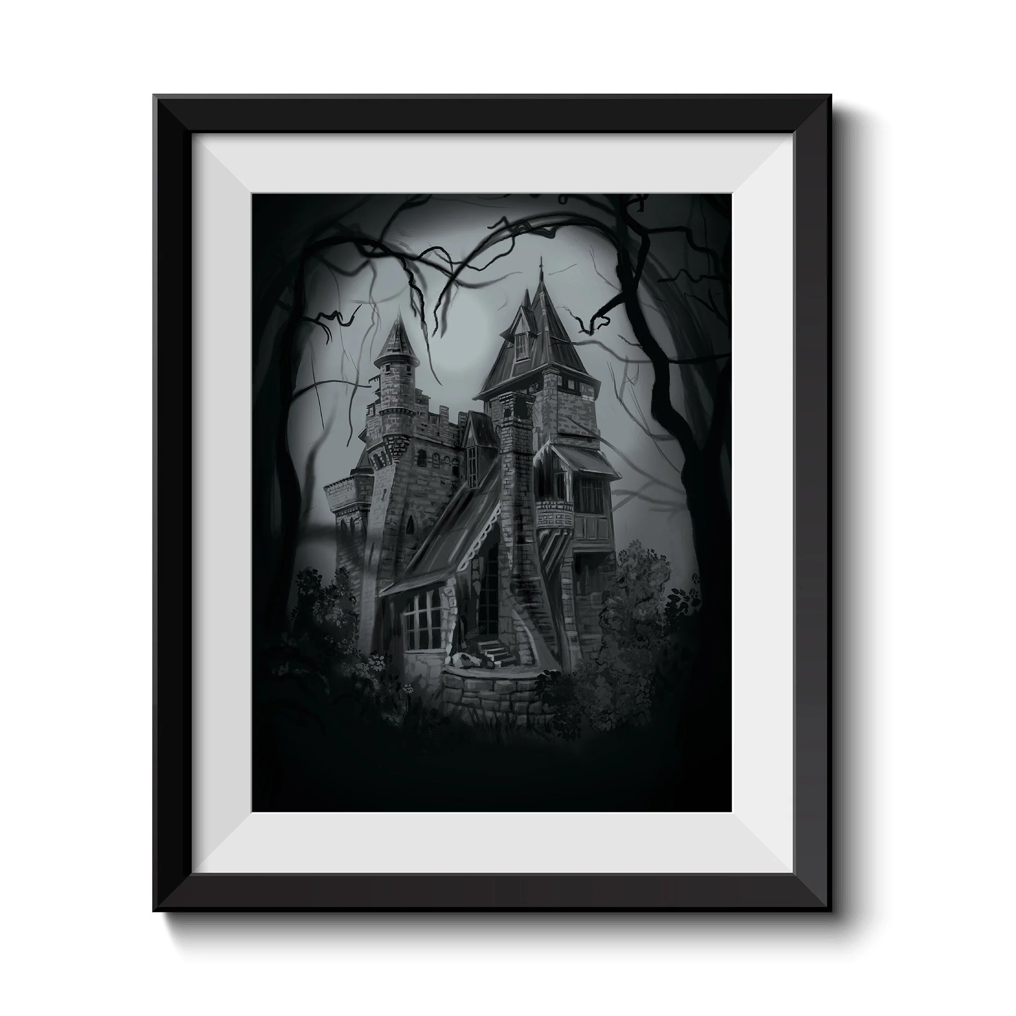 Digital illustration print of a “haunted house”. Perfect for Halloween or gothic type decorations. It’s printed on high quality heavy weight velvet/textured mat paper.